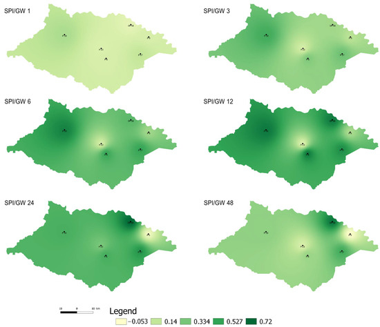 In order to check their correlation uniformity, we introduced SPI/GW (groundwater level) correlation analysis [44]. SPI/GW correlation analysis was performed in order to examine the relationship between meteorological drought and groundwater level. The spatial distributions of the calculated SPI/GW correlations over different time scales are presented in Figure 9. Compared with Figure 7, the maximum correlation coefficients for most observation wells appeared over a shorter time period, 12 and 24 months. Input data for mapping SPI/GW correlations are in given in the Supplementary Materials.