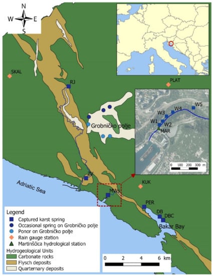 Upper right corner: position of the study area. The main map: hydrogeological map of the analyzed area showing the main karst springs (RJ—Rječina Spring, ZV–Zvir, MWs—Martišćica wells, PER–Perilo, DB—Dobra, DBC—Dobrica), Rječina River (blue line at the main map), occasional springs and ponors at Grobničko polje and rain gauge stations for sampling cumulative monthly precipitation (KUK—Kukuljanovo, SKAL—Škalnica, PLAT—Platak). The red dashed line square and map positioned right: position of Martinšćica wells W1–W5; blue line—the Javor stream, MAR—Martinšćica hydrological station. Based on [