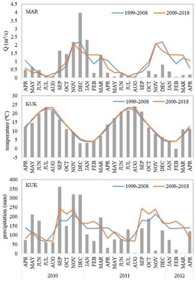 The bar graphs show the average monthly discharge at the Martinšćica hydrological station (MAR, upper graph), average monthly air temperatures (middle graph), and total monthly precipitation (bottom graph) from April 2010 to April 2012. Meteorological data are from the Kukuljanovo CMHS meteorological station (KUK). The graphs also show the monthly averages for each variable for the ten-year periods 1999–2008 (blue lines) and 2009–2018 (orange lines).
