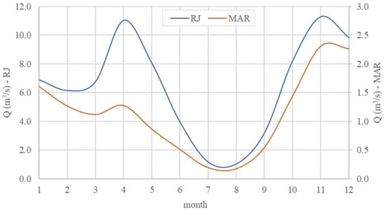 Monthly discharges for Rječina Spring (RJ) and Martinšćica hydrological station (MAR) from 1975 to 2016. Due to a lack of data, the years 2001, 2007, and 2008 are not included in the analysis. The months of the year are represented by the numbers 1–12, beginning with January and ending with December.