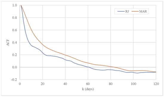 Auto-correlation functions (ACF) of daily discharge series at Rječina Spring (RJ) and Martinšćica hydrological station (MAR).