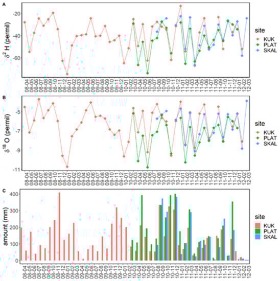 (A) δ2H values, (B) δ18O values, and (C) amount of monthly precipitation of cumulative monthly precipitation samples at Kukuljanovo (KUK), Platak (PLAT) and Škalnica (SKAL) rain gauging stations.