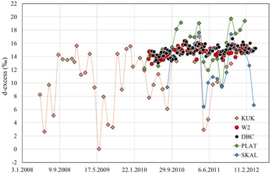 D-excess values for precipitation collected at the stations Kukuljanovo (KUK), Škalnica (SKAL) and Platak (PLAT) and groundwater from Martinšćica well 2 (W2) and Dobrica (DBC) spring.