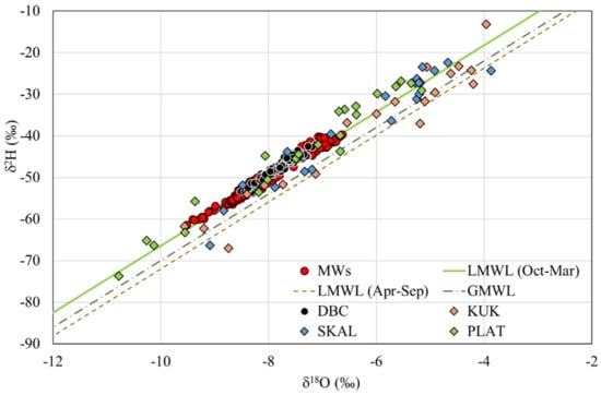 Correlation diagram of δ2H and δ18O values for precipitation collected at Kukuljanovo (KUK), Škalnica (SKAL), and Platak (PLAT) stations, and for groundwater from Martinšćica wells (MWs) and Dobrica spring (DBC). Local meteoric water lines (LMWLs) for precipitation corresponding to warm and cold parts of the hydrological year. Global meteoric water line (GMWL) is also given.