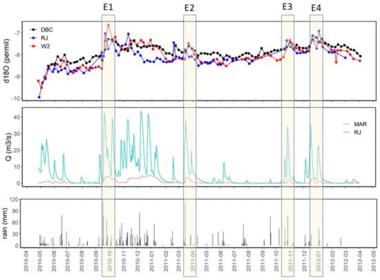 δ18O-time series of Rječina Spring (RJ), Martinšćica well 2 (W2) and Dobrica (DBC), discharges for RJ and Martinšćica discharge zone (MAR) and daily rainfall at CMHS meteorological station Kukuljanovo. E1–E4—isolated events in which the presence of newly infiltrated precipitation in the system was recognized.