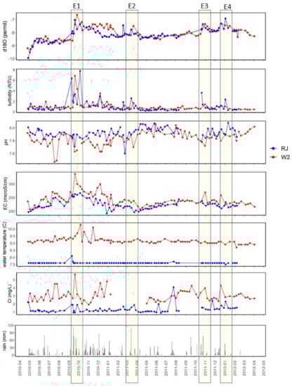 Time series of δ18O, turbidity, pH, electrical conductivity, temperature, and Cl content of Martinšćica well 2 (W2) and Rječina Spring (RJ) against daily rain quantities at CMHS meteorological station Kukuljanovo. E1–E4—isolated events in which the presence of newly infiltrated precipitation in the system was recognized.