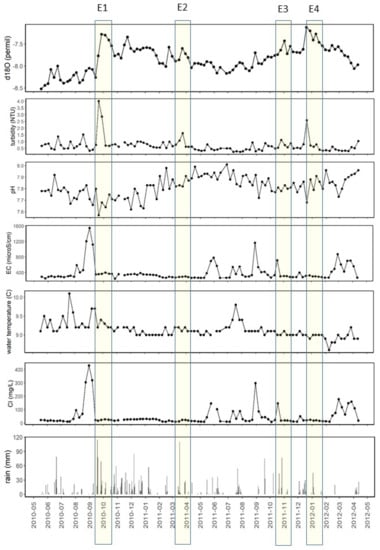 Time series of δ18O, turbidity, pH, electrical conductivity, temperature, and Cl content of Dobrica spring (DBC) against daily rain quantities at CMHS meteorological station Kukuljanovo. E1–E4—isolated events in which the presence of newly infiltrated precipitation in the system was recognized.