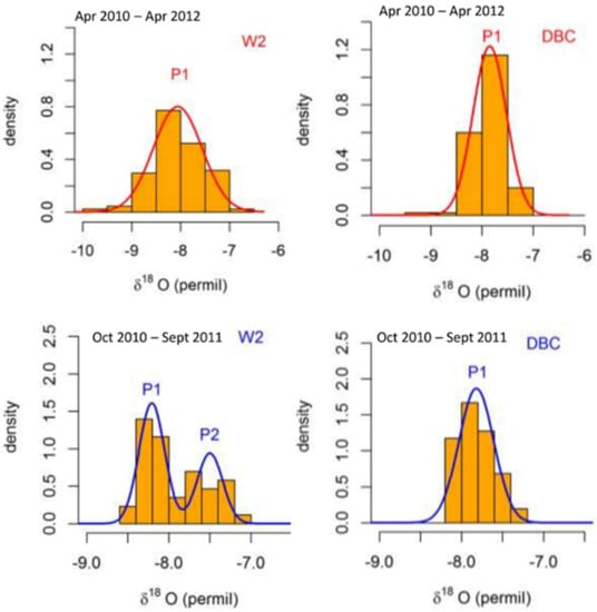 Parameter estimates of the groundwater δ18O values obtained by Gaussian mixture modelling for the entire study period (April 2010–April 2012) and the water year 2011. P1 and P2 correspond to individual peaks of a density estimate. W2—Martinšćica well 2, DBC—Dobrica spring.