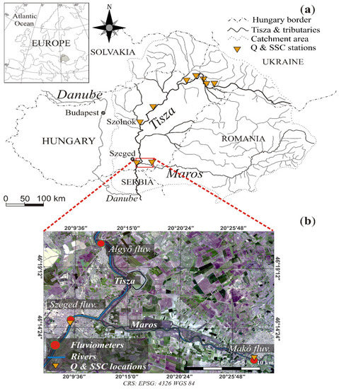 In Hungary, the medium-sized Tisza and Maros Rivers transport a large amount of suspended sediment (Tisza: 18.7 million t/y; Maros: 8.3 million t/y). The dominance of suspended sediment in their sediment budget is well reflected by the low proportion of their bedload transport (Tisza: 0.04%; Maros: 0.3%). Unfortunately, only 8 sediment gauging stations operate on the 962 km long Tisza and only one on the 750 km long Maros (Figure 1). In addition, the measurements are performed just once a month, regardless of the water stage. However, more frequent spatial and temporal data are needed to support environmental studies of the river system. Therefore, this study aims to calibrate and validate suspended sediment and discharge models for the Tisza and Maros Rivers by in situ and Sentinel-2 data. The derived models could be employed to estimate sediment discharge at ungauged periods. The detailed goals of this study are to: (1) derive the river discharge models based on AHG and AMHG methods, in addition to assessing the applicability and stability of discharge models derived by combing AHG with machine-learning algorithms, which was not assessed in the literature; (2) calibrate the suspended sediment models based on machine-learning algorithms, such as artificial neural network (ANN), support vector machine (SVM), and random forest (RF), comparing their results and performance; (3) apply the best derived suspended sediment and discharge models to historical images of Sentinel-2 (ungauged periods) to produce a longer time series of sediment discharge of both rivers within the study area.