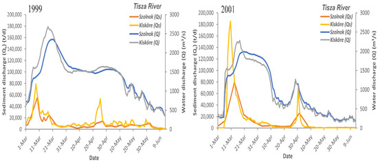The suspended sediment discharge of the Tisza (measured at Szolnok and Kisköre) can be very dissimilar even during two similar flood waves in the same period (between 1 March and 12 June 1999 and 2001) (Data source: [69,70]).