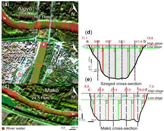 The hydrological data were collected at three gauging stations. Daily water stage and discharge data were available from Szeged (173.6 f km) on the Tisza River and from Makó (24.5 f km) on the Maros River for the period between January 2015 and May 2021. Upstream of the confluence of the two rivers at Algyő (192 f km), only daily water stage data (January 2015–January 2020) were available. Therefore, here, the discharge was estimated based on a rating curve. On the Lower Tisza (ca. 1 km downstream of the fluviometer at Szeged (Figure 1; Q and SSC locations)) and the Maros (at Makó), water discharge and suspended sediment concentration (SSC) data were also collected monthly between February 2015 and November 2020. The water discharge was measured by acoustic doppler current profiler (ADCP) and usually used to calibrate the rating curves at the fluviometers. Concurrently, the SSC data were obtained by depth integrated suspended sediment samples collected using a pump. The locations of the SSC sampling points were slightly different from one campaign to another as a result of varying stages. Therefore, the campaigns were grouped into high and low stages, and the average distances between the sampling points (or a sampling point and the riverbank) for every stage condition were considered (Figure 3). All data were obtained from the Lower Tisza Hydrological Directorate (ATIVIZIG).