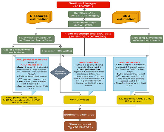 To predict water discharge based on the width measured by Sentinel-2 images, the AHG power–law, AHG machine-learning (ML), and AMHG water discharge models were developed; additionally, their results were compared to define the most suitable method for estimating sediment discharge.