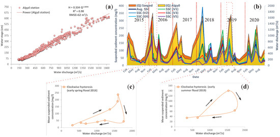 Rating curve for Algyő fluviometer (Tisza) based on the daily water stage (H) and discharge (Q) data between January 2020 and May 2021, fitted by power–law equation (PLE) (a). Temporal change in water discharge of the Tisza measured at Szeged and estimated by rating curve at Algyő, and the suspended sediment concentration (SSC) measured at Szeged (2015–2020) along (V1–V5) verticals (b). Examples on the hysteresis of the SSC-Q relationship (c,d).