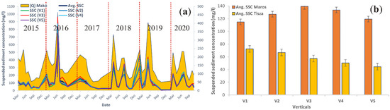 Temporal change in suspended sediment concentration (SSC) and water discharge of the Maros River at Makó (2015–2020) (a). The average of the suspended sediment concentrations at the five measured verticals along cross-sections of the Tisza (Szeged) and the Maros (Makó) Rivers (b).