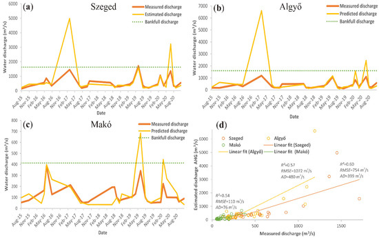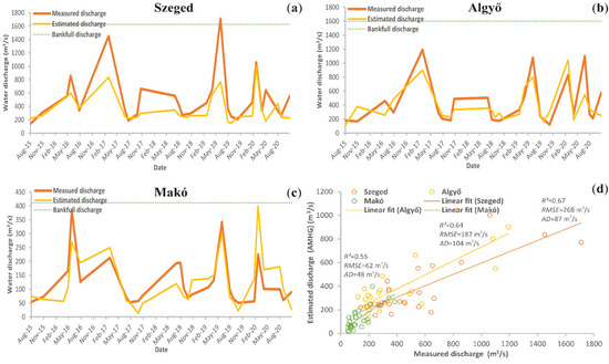 The average width of the five transects (Figure 3) at a particular date and the corresponding measured water discharge were fitted by power–law equations for Szeged, Algyő, and Makó gauging stations (see Appendix A, Figure A1). The estimated discharges by the AHG power–law models were compared to the measured discharges, and the R2, RMSE, and AD values were calculated (Figure 7). The performance of the AHG power–law model at the three stations was similar; however, it had a slightly better performance at the Szeged station (R2 = 0.6) than at Algyő (R2 = 0.57) or Makó (R2 = 0.54) stations. Usually, the models gave good predictions for the discharges below the bankfull (Szeged: 1628 m3/s, Algyő: 1600 m3/s, and Makó: 412 m3/s). However, worse predictions were obtained for discharges close or exceeding the bankfull discharge (e.g., floods in March 2017 at Szeged and Algyő, and in June 2019 at Makó), where the models significantly overestimated the discharges. Although the AHG power–law models of Szeged and Algyő stations had the highest R2, they produced high RMSE (Szeged: 754 m3/s; RMSE/mean observed: 1.07; Algyő: 1072 m3/s; RMSE/mean observed: 1.8) due to their significant overestimation of high discharges (e.g., March 2017 and July 2020).