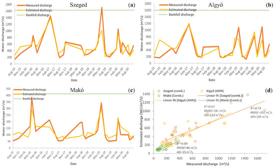 The actually measured and estimated water discharges at Szeged (a), Algyő (b), and Makó (c) gauging stations based on the AMHG models applied on the entire dataset. The R2, RMSE, AD values and the linear fitting line are also indicated for every station (d).