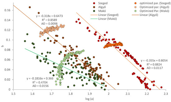 The AHG coefficients log (a) and exponents b of the 100 transects at Szeged, Algyő, and Makó gauging stations fitted by linear equation, and the optimized coefficients and exponents by the genetic algorithm (GA).