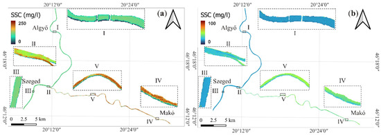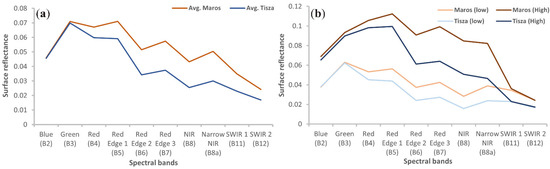 The spectral signatures of water in the Tisza (Szeged station) and Maros (Makó station) Rivers were analyzed to estimate their suspended sediment concentrations. The spectral signature based on the average of reflectance during low and high stages is depicted (Figure 11a). Furthermore, it was also represented for low and high stages separately for both rivers, as it is expected that they would produce different signatures due to the significant variations in SSC during these hydrological situations (Figure 11b). Generally, the reflectance of the Maros River was higher than the Tisza River; furthermore, the reflectance at high stages in both rivers was higher than at low stages (Figure 11a,b). Both rivers showed low reflectance at the blue band (B2), which refers to the turbidity of water, as clear water has high reflectance at this band [2]. Furthermore, a decreasing trend in the reflectance can be noticed between the red edge 2 (B6) and SWIR 2 (B12) bands. The highest reflectance occurred between the green (B3) and red edge 1 (B5) bands. The Tisza River showed the highest reflectance at the green (B3) band, while that in the Maros River was at the red edge 1 (B5) band (Figure 11a). Similarly, the green (B3) band had had the highest reflectance at the low stages, and the red edge 1 (B5) at the high stages of both rivers, which indicates the usefulness of the green (B3) band for detecting low SSC and red edge 1 (B5) for high SSC.