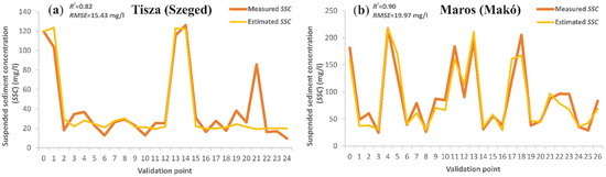 The best derived water discharge and SSC models were employed to produce a relatively long time series of the suspended sediment discharge at the three stations (Szeged, Algyő, and Makó). This was performed by applying these models for ungauged dates (122 images) covering the period between July 2015 and May 2021. The daily water discharge data (estimated by rating curves produced by the Lower Tisza Hydrological Directorate (ATIVIZIG) based on daily water stage measurements) at the three stations were used to evaluate the estimated discharge produced by the best discharge model.