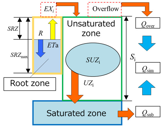 A schematic of the TOPMODEL concept is shown in Figure 4. The TOPMODEL version described in Mukae et al. [46] was applied in this study. Details of TOPMODEL are in Beven, Beven and Kirkby and Mukae et al. [8,44,46,47].