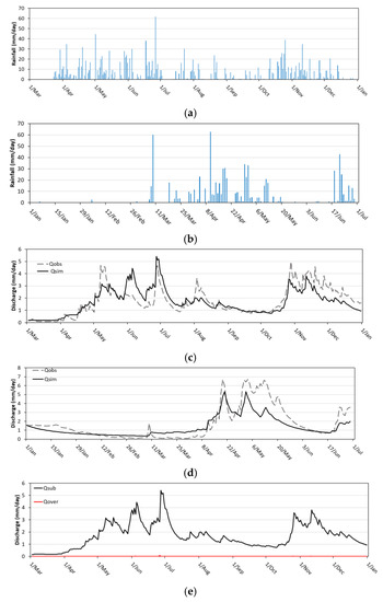 The ‘over-prediction’ of flow as subsurface flow and the subsequent ‘under-prediction’ of overland flow by TOPMODEL following a rainfall event(s) could be attributed to the large value of the Te parameter. This could point to the existence of the ‘preferential’ flow pathways in the catchment that are described in Beven [61]. The differing behaviour of both models in hydrograph separation during rain season(s) requires further investigation, e.g., through hydrograph separation experiments, etc., to affirm the more realistic flow separation curves. Or perhaps the details of hydrograph separation are not important for irrigation planning?