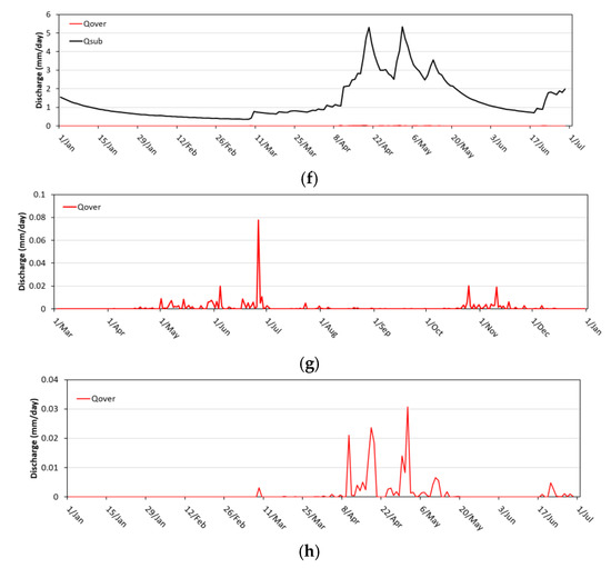 Observed rainfall, observed hydrograph and the hydrographs simulated by TOPMODEL. (a) Observed rainfall in 2015; (b) Observed rainfall in 2016; (c) Observed hydrograph and the hydrograph simulated during model calibration in 2015; (d) Observed hydrograph and the hydrograph simulated during model validation in 2016; (e) Hydrograph separation in 2015 during model calibration. Note that the overland flow was too small to be represented on this graph; (f) Hydrograph separation in 2016 during model validation. Note again that the overland flow was too small to be detected on this graph; (g) Overland flow prediction in 2015 during model calibration; and (h) Overland flow prediction in 2016 during the model validation period. Qobs (observed discharge); Qsim (simulated discharge); Qover (overland flow); Qsub (subsurface flow).