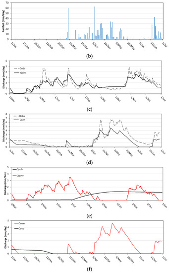 Observed rainfall, observed hydrograph and the hydrographs simulated by tank model. (a) Observed rainfall in 2015; (b) Observed rainfall in 2016; (c) Observed hydrograph and the hydrograph simulated during model calibration in 2015; (d) Observed hydrograph and the hydrograph simulated during model validation in 2016; (e) Hydrograph separation in 2015 during model calibration; (f) Hydrograph separation in 2016 during model validation. Qobs (observed discharge); Qsim (simulated discharge); Qover (overland flow); Qsub (subsurface flow).