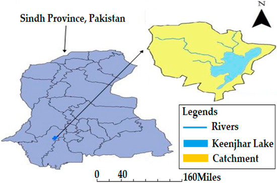 Keenjhar Lake is located (24°57′ N 68°03′ E) in Thatta District of Pakistan. The lake is considered as the major source of drinking water supply for more than 15 million people in Karachi City and about 0.15 million people in Thatta [27]. The average annual rainfall in the area is 175 mm, which mostly falls during the monsoon season. The area experiences very hot summer and cold winter and the climate of the area is characterized as subtropical [11]. The area of lake is mainly covered by rocky, gravelly, and loamy soils. The lake is fed by the K.B Feeder originating from Kotri Barrage, which arrives at the northwest corner of the lake. It is also fed by many other small seasonal streams that enter the western and northern shores. K.B Feeder is 38 miles in length and its designed discharge is 9100 cusecs at the head [28]. The maximum length of the lake is 24 km while the maximum width is 6 km. The total surface area of the lake is 13,468 ha (33,280 acres) with a total water volume of 0.53 × 106 acre-ft (650 hm3). The average depth of the lake is 1 m and ranges maximum up to 7.9 m (26 ft) [30]. In 1977, due to the Sindh wildlife protection ordinance, Keenjhar Lake was declared a wildlife sanctuary. The sanctuary includes the lake and the area along the Indus Highway. Enriched with biological diversity, Keenjhar Lake is one of the popular locations for recreation and also serves as a breeding place for migratory birds [31]. The location of the study area is shown in Figure 1.