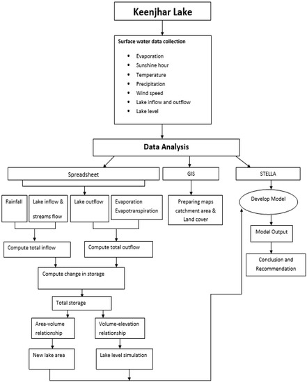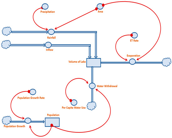 A water-balance model can help in understanding the problem and selecting the best practices and solutions by establishing a sustainable level of water withdrawal. Therefore, it is important to look at the historical trends and the natural water levels of Keenjhar Lake to produce a management framework. The integrated modeling method plays an important role in evaluating the water crisis [26,27,28,29,30,31,32,33]. One of the most appropriate tools for environmental modeling is the system dynamics (SD) method, which was developed in the 1950s by Jay Forrestor and his associates. In this study, the system dynamics method is used to develop a dynamic simulation model. The basic difference between system dynamics and other modeling methods is the way the flows and stocks affect each other through feedback loops are considered. The stocks and flows together display and affect system properties that cannot be accredited to any of the individual components that make up a system. There are several available software packages that use the principle of system dynamics, such as STELLA, WEAP, PowerSim, VenSim, etc. Overall, the aforementioned models are essential research tools and have improved our understanding of water balance estimation. However, they have been criticized for being too abstract and difficult to understand, use, and apply; for requiring too much input data and time entering data, and for requiring advanced training. It is noted that the STELLA software has been widely used in biological, ecological, and environmental studies [34,35,36]. The software produces finite difference equations that describe the graphical model and allows users to select a numerical analysis method to apply to the system, either the Euler method or various Runge–Kutta methods (either second- or fourth-order) [37]. System dynamics is the theory of system structures and a set of tools for representing complex systems and analyzing their dynamic behavior. The SD approach is a policy-based methodology that evaluates the effect of policy changes on a system. The most important feature of this approach is to elucidate the endogenous structure of the system under study to see how different elements of the system relate to one another and to experiment with changing relations within the considered system when different decisions are included. The SD approach is an appropriate technique for simulating complex problems in integrated water resources [38].
