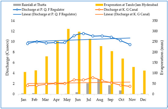 Daily discharge data of Keenjhar Lake and lake water levels of gauging stations for the last 17 years (2000–2016) were collected from Sindh Irrigation department. On the other hand, daily and monthly meteorological data of rainfall and temperature (maximum and minimum) for last 17 years were collected from the Pakistan Meteorological Department (PMD). Additionally, daily and monthly evaporation, relative humidity, wind speed, and sunshine hours for the last 17 years were collected from the Tando Jam Meteorological Station. The average annual rainfall in the area is 175 mm, which mostly falls during the monsoon. The maximum temperature during the summer is 47 °C and the average minimum temperature between the ranges of 1 and 2 °C during January. Table 1a shows mean monthly flow and Table 1b shows the mean monthly evaporation and evapotranspiration of the Keenjhar Lake. Summary of collected data at monthly temporal resolution is shown in Figure 3.