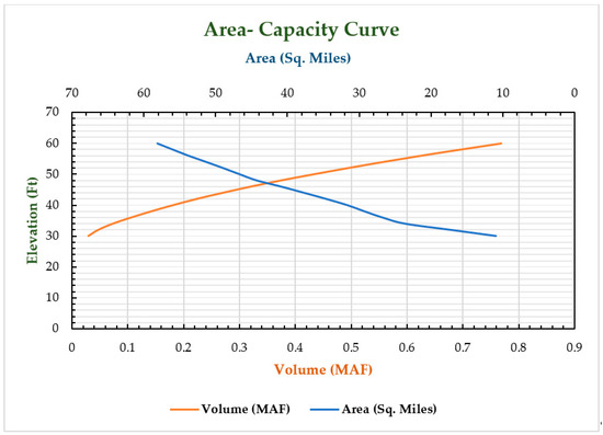 Surface area volume and elevation curves were generated for the Keenjhar Lake. Arc Scene was deployed to generate visual model. In addition, it was used to produce the initial point data as well as the final TIN and contour data. The final TIN was converted to a grid format and combined with a Digital Elevation Model (DEM) used in Arc Scene. The bathymetry model of the lake was built along with elevation, area, and volume. The reservoir capacity of Keenjhar Lake at the proposed conservation level of 57 ft is 660,000 acre-ft. Figure 7 exhibits the area capacity curve of the lake. According to the criterion of storage capacity, the Keenjhar Lake reservoir falls into the category of major reservoirs, whereas according to height of embankment criteria, it falls into the category of minor reservoirs [43].