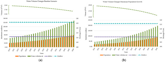 The results obtained from all the above-mentioned scenarios revealed that in the first scenario, the net growth rate for the baseline was 3.63%, which projected the population of the area around Keenjhar Lake to rise by 50 million by the year 2050. This population growth rate of the area gives a high growth rate and a large size of the current population. This shows a significant amount of water abstraction from Keenjhar Lake, which has a considerable effect on the overall water volume of the lake. This presents that the discharge of Keenjhar Lake is not effective for sustainable water flows in the long-term. In the second scenario, a maximum population growth rate of 5% is considered. The results are shown in Figure 10a, which shows an increase of the population by 80 million people by the year 2050. This increase in population has a considerable effect on the water withdrawal from the lake due to high water demand, which results in a decrease in the water volume of Keenjhar Lake. A minimum population net growth rate of 3% is taken for the third scenario. The result is shown in Figure 10b, which shows a population decrease of 40 million people in the overall population and resulting in less withdrawal of water from the lake.
