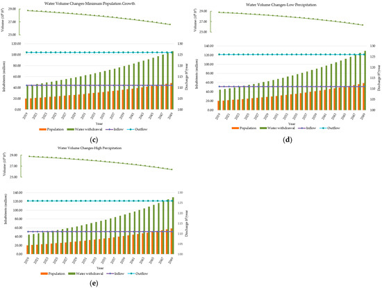 Simulated water volume changes in Keenjhar Lake with scenario (a) base line; (b) maximum population growth; (c) minimum population growth; (d) high rainfall; (e) low rainfall.