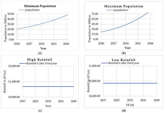 According to the Pakistan statistical census [10] and the UN report [29], the population of the Karachi and Thatta were estimated to be about 14,552,850. Based on the UN report and Pakistan’s statistical census population data population was projected for 2017–2050. The results were similar to those obtained by using a net growth rate of 3.63%. Results show that the population of the study area will rise to 50 million in 2050. Simulated water volume changes regarding lake inflow and water withdrawal are in ft3/year, and the volume of the lake in ft3 is shown in Figure 9a. It also shows that lake volume decreased from 9.066 × 1017 ft3 to 9.066 × 1017 ft3. The inflow of water remained constant at 3.784 × 1010 ft3/yr and the withdrawal of water increased from 3 × 1010 ft3/yr to 1.2 × 1011 ft3/yr. Based on simulated values when the withdrawal of water and population growth were not considered in the model. It shows that all variables almost remain constant. A very small change occurs in evaporation and rainfall. Evaporation decreases from 180 ft3/yr to 179 ft3/yr, rainfall decreases from 10,992 ft3/yr to 10,991 ft3/yr, and the inflow of water remains constant at 3.784 × 1010 ft3/yr.