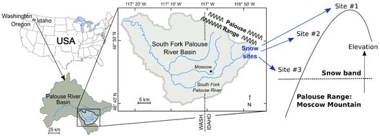 Study area location in the Palouse Range of the South Fork Palouse River Basin, northern Idaho, USA. Snow sampling network consisted of three sample locations within the primary snow band of Moscow Mountain.