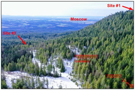 To examine the evolution of the snowpack for evaluating snowmelt and runoff isotope signals, a multi-elevation sampling network was established in the Palouse Range of north-central Idaho, USA (Figure 1). The region’s climate is driven by its proximity to the Pacific Ocean and the northern Rocky Mountains, which produces a winter maritime climate and a summer continental climate [,,,]. Annually, this basin receives approximately 60 cm of precipitation (water equivalent), including 126 cm of snowfall []. The Palouse Range snowpack averages a snow-water equivalent of 50 cm at its highest elevations []. The snowpack will develop in late fall and typically last until late spring. Ephemeral creeks will respond to snowmelt and precipitation in winter/spring and may contain flow into summer. These creeks, along with subsurface water, feed downgradient intermittent and perennial creeks along with providing recharge to the local aquifer system of the basin [,,,]. The hydrologic reservoir and recharge source that is the Palouse Range snowpack has produced variable isotope signals in connected surface-water and groundwater systems [,,,].
