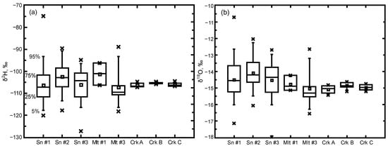 Distribution of δ2H (a) and δ18O (b) for snowpack (Sn), snowmelt (Mlt), and ephemeral creeks (Crk) in the study area. Boxplots indicate the median, mean (□), interquartile range (25% to 75%), and whisker range of 5% to 95% along with outliers (×).