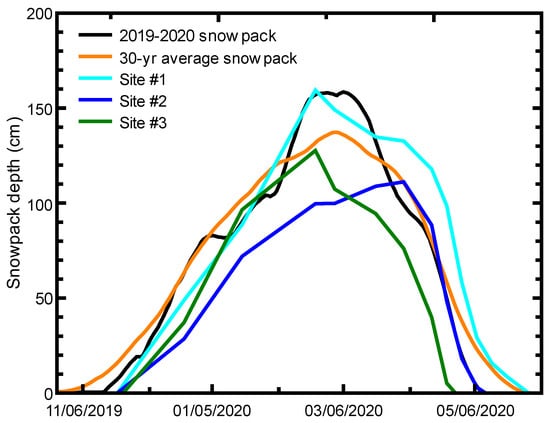 The range of isotope values for the snowpack, snowmelt, and ephemeral creeks occurred during a relatively average year for snowpack accumulation. The 2019–2020 snowpack at the SNOTEL site and the adjacent Site #1 (located in the same field area) were larger (160 cm peak) than the 30-year (1981–2010) average of 140 cm [], but the 2019–2020 snowpack lasted a relatively similar duration compared to the 30-year average (Figure 5). The lowest elevation site (#3) produced a similar accumulation trend compared to Site #1, but the mid-elevation site (#2) indicated a later accumulation peak, although an expected snowpack duration between the higher and lower elevation sites. The larger open field quality of Site #2 appears to have delayed peak accumulation that may correlate to the relatively more enriched isotope signals (Figure 3).