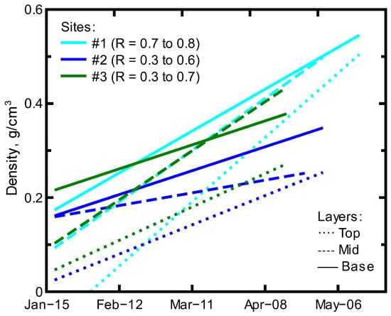 Linear regression trendlines of the density data collected for each layer at the three study sites.
