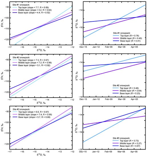 Linear regression trendlines of δ2H and δ18O and δ18O with time for the snowpack sampling sites by layer.