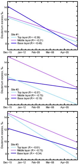 While the δ2H and δ18O relationship can indicate the effects of evaporation/sublimation, the second order isotopic parameter of d-excess can indicate vapor re-circulation/transport or the conditions in an evolving system such as a snowpack. D-excess is a function of the isotopic composition of hydrogen (δ2H) and oxygen (δ18O) in water (d-excess = δ2H − 8 × δ18O) [], where the d-excess will be altered during circulation because of diffusivity differences from differences in molecular weight (e.g., 1H2H16O = 19 g·mol/mol compared to 1H1H18O = 20 g·mol/mol). D-excess responds to humidity/evaporation changes at the vapor source and with precipitation (subcloud evaporation) [,,]. Redistribution in a system, such as through the movement of vapor and melt in a snowpack, can produce additional isotope signal differences as melt water and water vapor migrate through a snowpack and undergo freezing (re-deposition) or are lost from the system. Snowfall in the study area is expected to have a relatively large d-excess that is greater with elevation [], which will be altered with aging of the snowpack. The linear trends of d-excess with time (Figure 8) indicate an overall decrease in d-excess in all layers at all three snowpack sites. This trend is inverse to the enrichment trend in δ18O with time (Figure 7). This d-excess trend is reflective of vapor and melt migration in the snowpack during aging, which corresponds to the enrichment trend of δ18O.