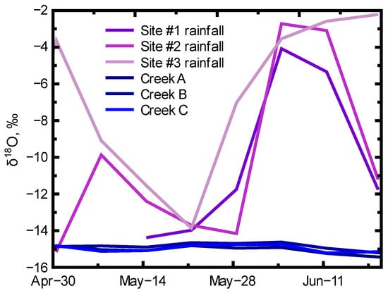Temporal trends of δ18O values for spring rainfall collected at the three snowpack sampling locations (Sites #1–3) and the three (A, B, and C) ephemeral creeks located between sites #2 and #3.