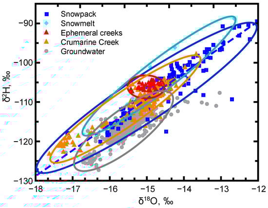 Groupings of δ2H and δ18O values indicative of the evolution and variability of the isotope signals from snowpack and snowmelt to local surface-water and groundwater systems. Crumarine Creek and groundwater values are from Sanchez-Murillo et al. [] and Candel et al. [], respectively.