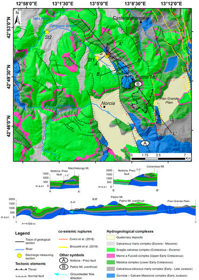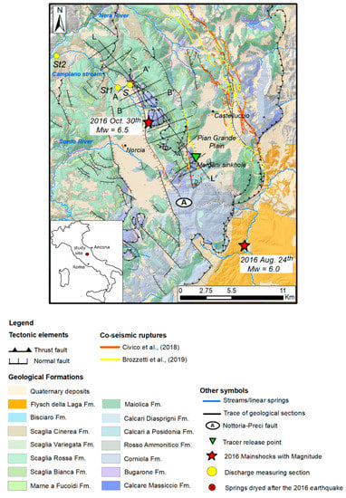 The study area is part of the Sibillini Mts. chain representing the south-eastern portion of the Umbria-Marche Apennines, Central Italy. The Umbria-Marche Apennines are a thrust belt made of asymmetrical East-verging folds and thrusts that were formed during the middle-upper Miocene contractional tectonics, resulting from the convergence between the continental margins of Corsica-Sardinia and the Adria micro-plate [18]. The Umbria-Marche Stratigraphic Succession is made up of a thick sedimentary cover that is superimposed on a Paleozoic crystalline basement overlayed by continental and siliciclastic strata (Permo-Triassic). The sedimentary cover is constituted by Triassic evaporites (Anidriti di Burano Fm.), followed by the dominantly carbonate Umbria-Marche Stratigraphic succession (Jurassic-Oligocene), about 1500 m thick, starting from the Calcare Massiccio Fm. at the bottom up to the Scaglia Cinerea Fm. at the top. The Anidriti di Burano Fm. never crops out in the study area. The compressional tectonic phase was followed by an extensional one that began in the Early Pleistocene (currently still active), and gave origin to the depressions of Norcia, Cascia and Castelluccio (Pian Grande Plain) [12,19,20,21]. The Vettore Mt.–Bove Mt. and the Nottoria–Preci normal fault systems, each producing dislocations up to 1000 m [22,23,24,25,26], represent the main fault systems of the area with lengths > 30 km (Figure 1). The described extensional tectonic elements assumed a decisive role in the hydro-structural arrangement of the area, in the delimitation of large regional aquifers and in the identification of the main groundwater flow directions [12,21]. In Figure 1, the surface co-seismic ruptures [27,28,29] related to the main shocks of the 2016 earthquakes (Mw = 6.0 Amatrice and Mw = 6.5 Norcia), mapped along the above-mentioned normal faults, are reported. These data were collected for a length of more than 30 km in the days and weeks following the main seismic events. The co-seismic ruptures are systematically aligned with sets of normal faults [19,29,30] and are mostly coincident with the traces of the Mt. Vettore–Mt. Bove SW-dipping faults and the NE-dipping antithetic faults bordering westward of the Pian Grande Plain. Along the Nottoria–Preci fault, near the Norcia and Campi villages, some minor ruptures were also detected (Figure 1).