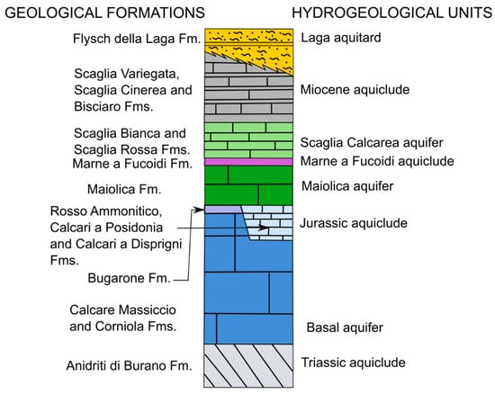 The results obtained from the hydrological investigations were carried out for more than two decades in this area and are summarized in several studies that are available in the scientific literature and in technical reports [31,32,33,34,35,36,37,38,39,40,41,42,43,44]. The Umbria-Marche Stratigraphic Succession is made by eight hydrogeological complexes [21,45], among which the Basal aquifer (the regional one), the Maiolica aquifer and the Scaglia Calcarea aquifer are recognized (Figure 2). The Basal aquifer is hosted in the Calcare Massiccio, Bugarone and Corniola geological formations (Fms.) and is characterized by a well-developed karstic system; it overlies the Triassic dolomite and anhydrite sequence of the Anidiriti di Burano Fm. [46] and acts as a regional aquiclude complex. The Basal aquifer is responsible for the main discharge increases along streams and rivers with several linear springs occurring along the water courses.