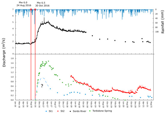 Despite a lack of data immediately after the seismic sequence, by comparing the Campiano discharge trends with the discharge of the Sordo River and Torbidone spring (upper Sordo River basin), it is possible to hypothesize that St1 and St2 behaved similarly to them after the October 30th, 2016, earthquake. Right after this seismic shock, the Torbidone spring, the behaviour of which is recognised to be intermittent due to strong earthquakes [60], displayed a sudden increase in discharge passing from 0 to 1.6 m3/s in less than four months [15]. Thereafter, except during the recharge periods, its discharge values decreased during the years until summer 2020 when the spring totally dried. At the same time, the Sordo River, which is monitored just downstream of Norcia village, showed a rapid increase in discharge just after the October 30th earthquake (passing from 1.9 to 5.0 m3/s), preceded by a slight discharge increase after the 24 August 2016 earthquake (from 1.5 to 1.9 m3/s). Both increases are not justified by meteoric recharge processes [12]. Thereafter, the Sordo River discharge gradually decreased, except during the recharge periods. It can be observed that the decreasing discharge trend of St1 and St2 is quite similar to those observed on Torbidone spring and Sordo River, suggesting that, also for Campiano River, the decreasing trend was preceded by a significant discharge increase.
