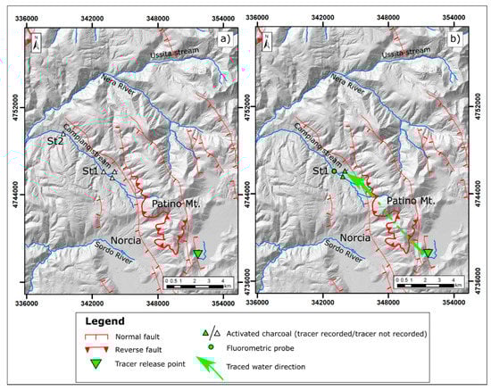 Main tracers’ direction from the release point (Mergàni sinking stream) to the analysed basin (Campiano catchment) location of the main tectonic lineaments. (a) Pre-seismic conditions; (b) post-seismic conditions.