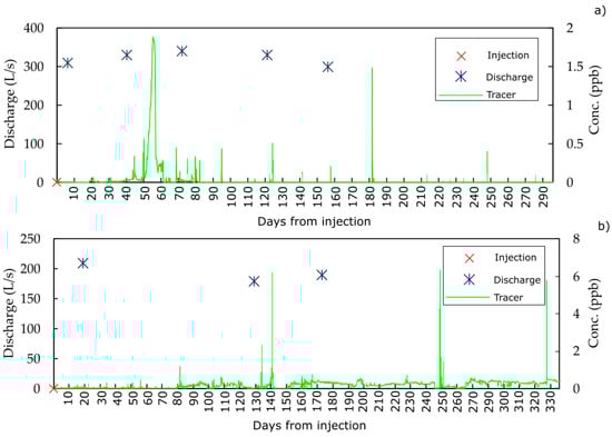 Figure 7b shows the tracer arrivals and the discharge values that were recorded during TEST5. The arrivals are characterised by a superposition of pulses lasting several hours with a dominant hydro-dispersive character. In particular, during May, October and December 2019, very concentrated peaks were recorded about 140, 250 and 330 days after the injection with concentrations up to 6.3 ppb. These peaks are superimposed on the classic bell-shape, denoting a typically dispersive hydrodynamic feature. The first significant arrival of the tracer during TEST5 is observed 81 days after the injection. Unfortunately, the lack of continuous discharge data does not permit correlation of the discharge regime with the tracer arrivals.
