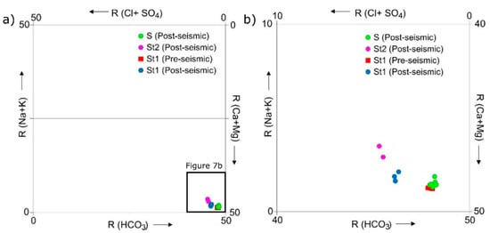 (a) Plot of the chemical composition of Campiano stream monitoring points (pre- and post-seismic data are available for St1, while only post-seismic data are available for S and St2) on the Langelier–Ludwig diagram. (b) Detail of the Langelier–Ludwig referring to the box reported in (a).