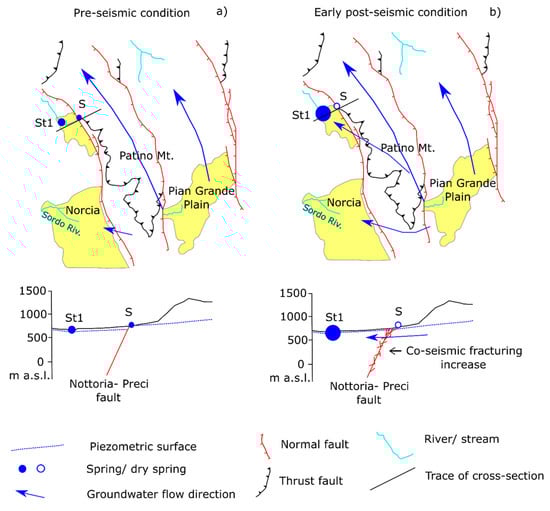 In this context, the increase in hydraulic conductivity across the Nottoria–Preci fault that is due to the intense fracturing produced by the seismic shocks, determined a faster drainage of the aquifer and a consequent lowering of the piezometric level (Figure 10). This led to the drying up of springs—located at a higher elevation in the fault area—(red dots in Figure 1) which are still dry, probably due also to a concomitant drought period during the post-seismic period. On the other hand, the arrival of water coming from the southeast through the Nottoria–Preci fault system caused an increase in discharge in the monitored rivers and streams located west of the Nottoria–Preci fault system, where co-seismic ruptures were observed [28,29]. Valerio et al. [65] reported the co-seismic ground deformations related to the Mw 6.5 Norcia earthquake evidencing a subsidence, up to 98 cm, in the area between the Vettore Mt.–Bove Mt. fault system and the Nottoria–Preci fault (where S is located) and a smaller uplift west of this last area (where St1 and St2 are located). These deformations seem to be less relevant than the co-seismic fracturing along the Nottoria–Preci on the post-seismic behaviour of the Campiano stream.